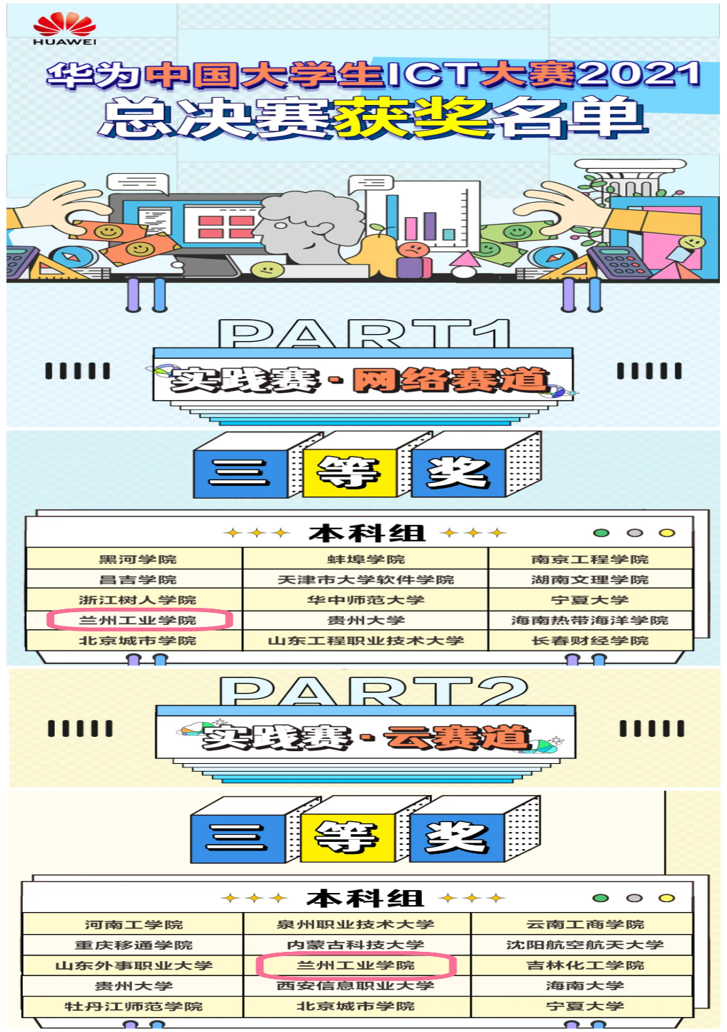 12月25日晚19时,华为中国大学生ICT大赛2021总决赛颁奖典礼隆重举行,以电子信息工程学院学生为主的两支代表队,共6位同学代表甘肃省的本科院校,参加了华为ICT大赛2021年网络赛道和云赛道的全国总决赛,两支代表队均获得全国第三名的优异成绩。