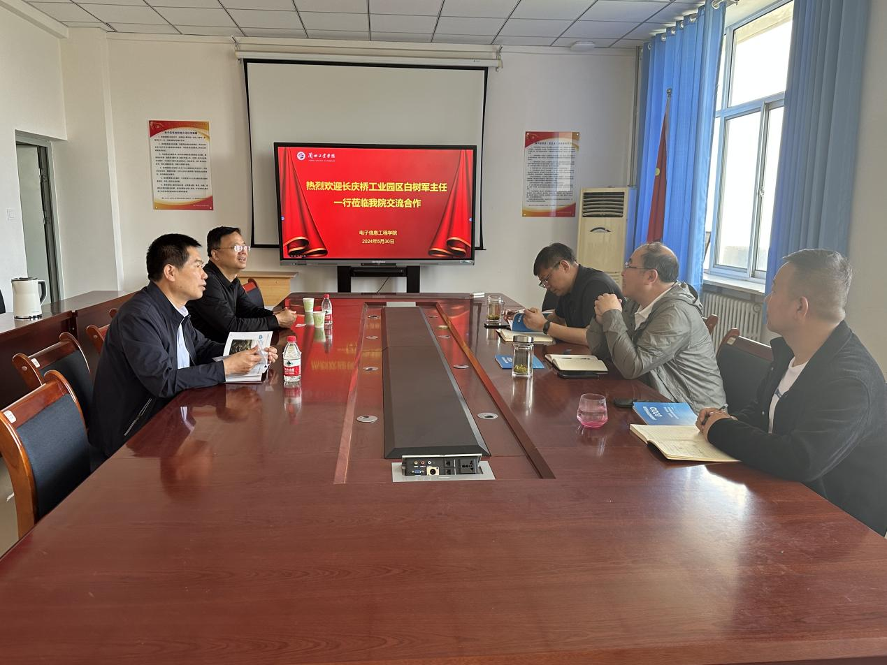 5月30日,庆阳长庆桥工业园区管委会副主任白树军一行来电子信息工程学院开展交流合作。学院院长周征、副院长李伟等参加会议。