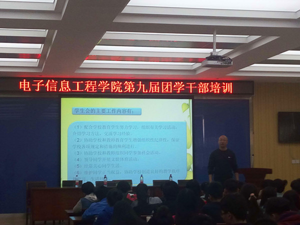 3月30日中午12:30在新阶梯201室,电子信息工程学院团学干部培训班顺利开班。此次团学干部培训班旨在使团干部和学生会成员能够尽快的熟悉团支部和学生会的业务,进一步提高团学干部的自身素养,更好的为广大团员、学生提供更优质的服务。参加了此次培训的团学干部有电子信息工程学院各班班委、党员以及全体学生会成员。