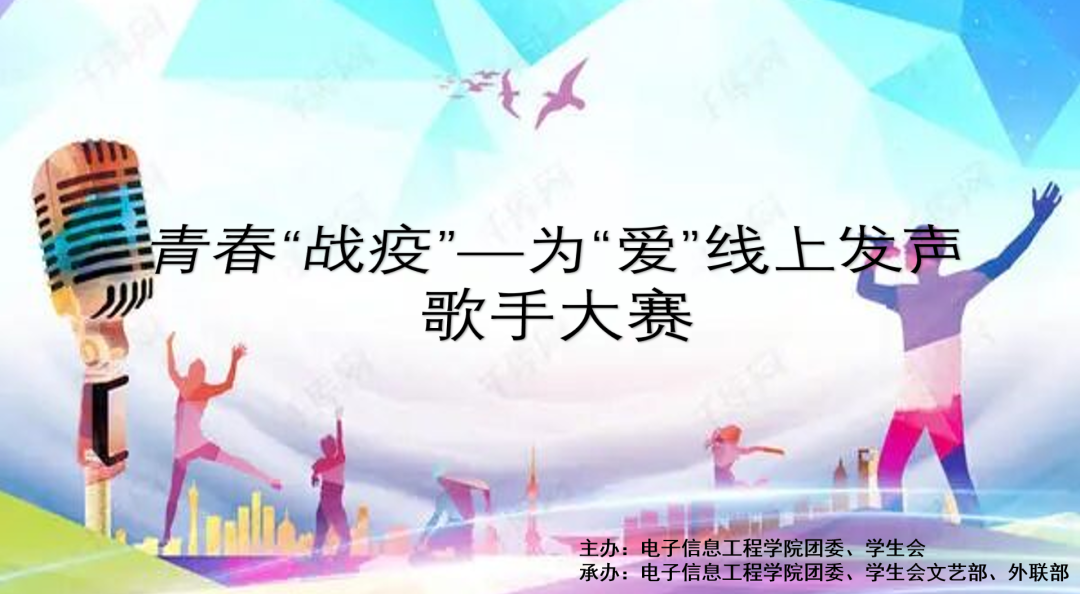 一场突如其来的疫情,使我们开启了封校、线上上课。因为疫情,所有的第二课堂活动都按下了暂停键,同学们的生活也少了许多乐趣。为了丰富封校后的文娱活动,让同学们舒展身心。电子信息工程学院于2021年11月19日举办“青春战‘疫’,为‘爱’线上发声”歌手大赛。本次比赛首次采用线上参赛、线上评比的独特赛制,吸引了同学们踊跃报名参与