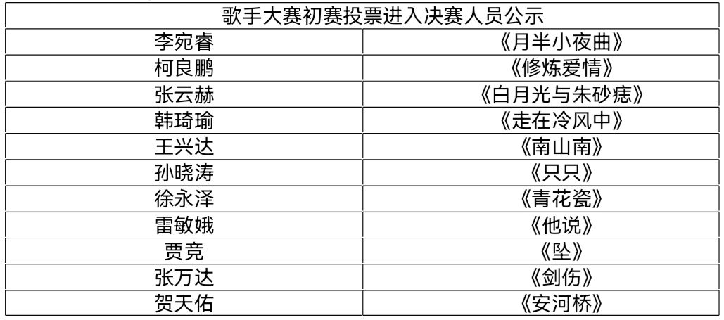 初赛阶段,19位参赛选手提前录制好参赛曲目,海选现场通过线上投票的形式,按照每位选手所得票数高低,排名前11名同学进入决赛。