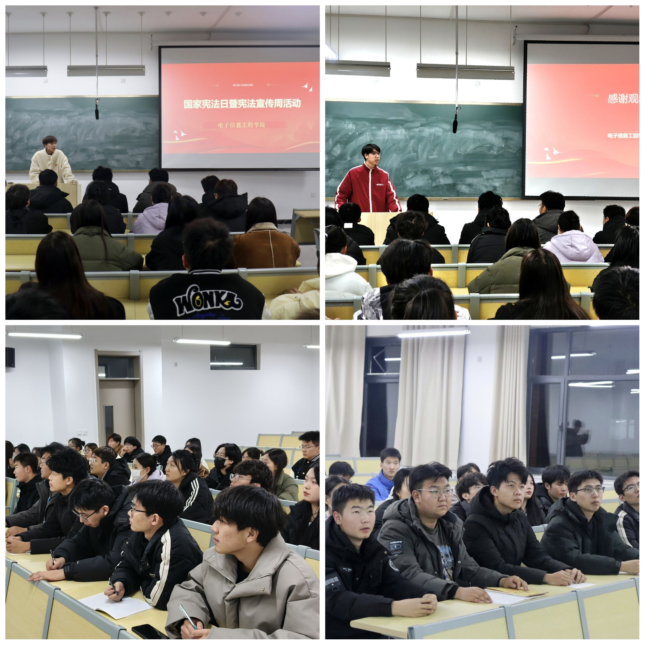 为增强学生宪法意识,弘扬宪法精神,推进法治校园建设。2024年12月2日19时,电子信息工程学院在公共教学楼B109成功举办了国家宪法日暨宪法宣传活动。各班团支书、团干部以及学生第六党支部全体党员参加,活动由团委副书记牛家卫主持。
