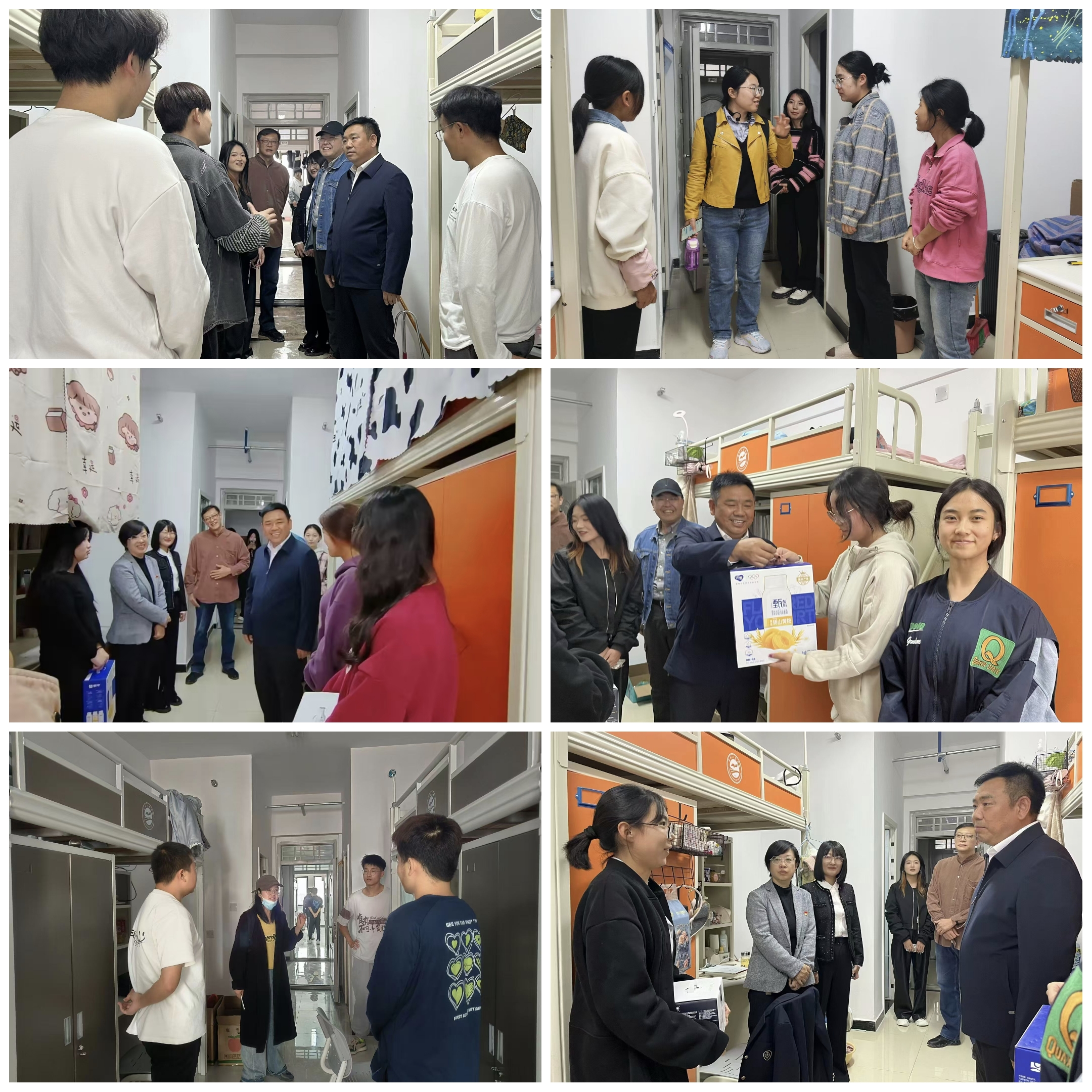 在慰问过程中,各位领导和老师们带着满满的关爱与祝福,走访各个学生宿舍。他们与学生们倾心交谈,关心着同学们的学习进展,了解大家在新校区的需求和困难,让远离家乡的学子们感受到了家的温暖。同学们都十分热情,现场也被开心的笑声淹没,大家共同沉浸在幸福、热情的氛围中。