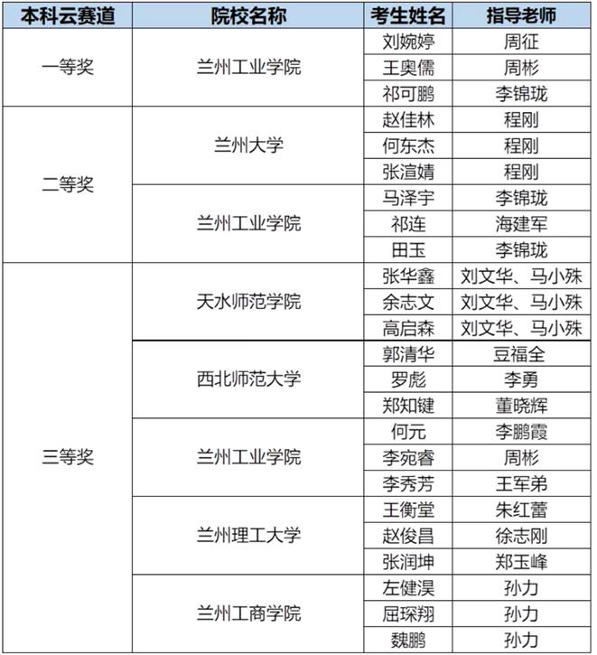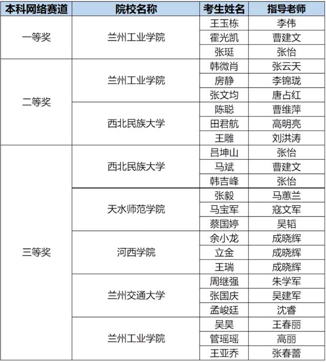 本届华为ICT大赛分省内预赛、省内决赛和全国总决赛三个赛程,在每个省的云赛道和网络赛道的决赛中,各设置1个一等奖,2个二等奖和5个三等奖。12月11日,我院获得一等奖的两个小组将代表甘肃省的本科院校,与全国其余30个省市区的60个一等奖代表队参加华为ICT全国总决赛。
